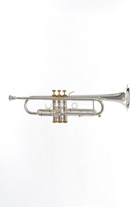 解説2 | 調性:B♭ 仕上げ:銀メッキ仕上げ ケース:セミハードケース ボア:11.66mm ベル:121.8mm イエローブラス リードパイプ:イエローブラス ピストン:ステンレス |